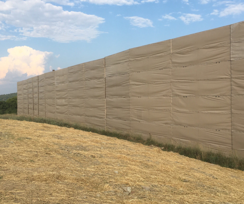 The exterior of the blanket is covered with a gray vinyl UV-protected shell which faces away from the noise source and a vinyl mesh screen facing toward the noise source to allow for noise absorption. All materials used in the construction of the blanket have a superb FR rating.