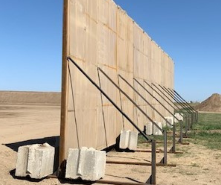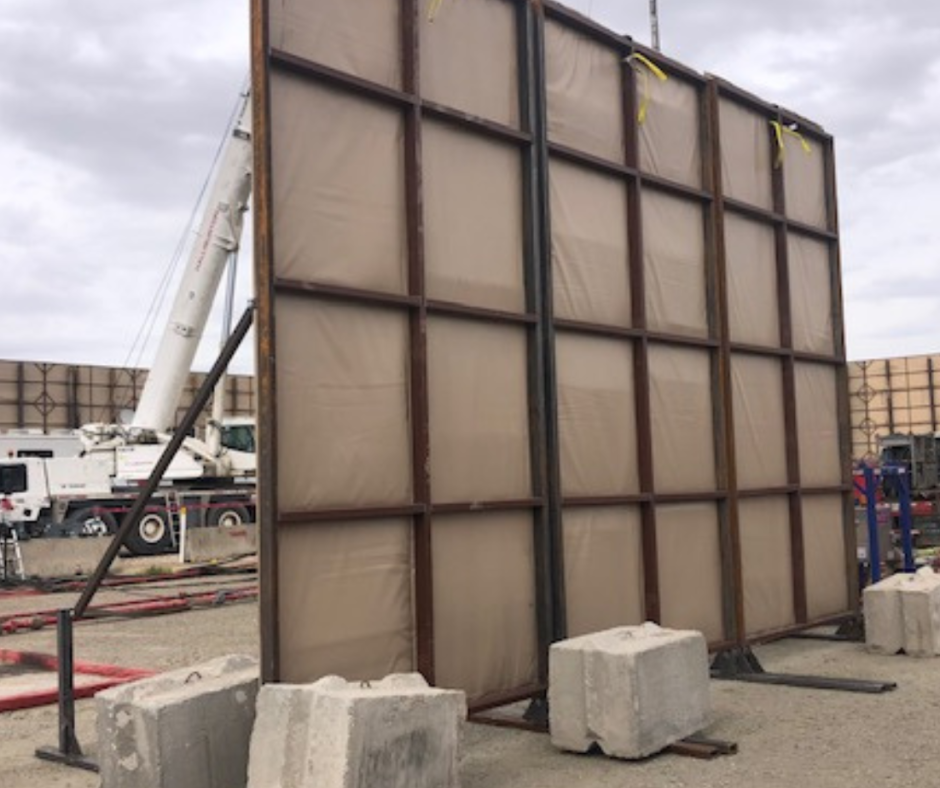 Our Free Standing Acoustical Panels are 8’ wide x 12’& 16’ tall. These panels are light weight and easily installed with a 3-man crew, (no equipment necessary.) The panels share a support leg on each side and can be setup in any configuration. The panels are then anchored into the ground with 1-inch iron rod stakes which are driven through the support legs to prevent the panels from blowing over. One-inch angle iron braces are supplied and attached to the leg and panel for extra stability. The acoustical blanket attached to the panels are rated STC-27 and NRC- 85.